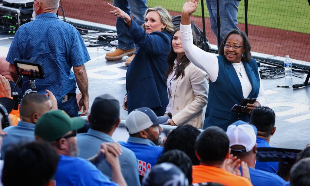 Sen. Majority Leader Nicole Cannizzaro, left, (D-Las Vegas) Assembly members Sandra Jauregui, left, (D-Las Vegas, and Daniele Monroe-Moreno (D-Las Vegas) acknowledge local trade union members during a rally to support Summerlin studio project at Las Vegas Ballpark on Oct.15, 2025. (Jeff Scheid/ The Nevada Independent)